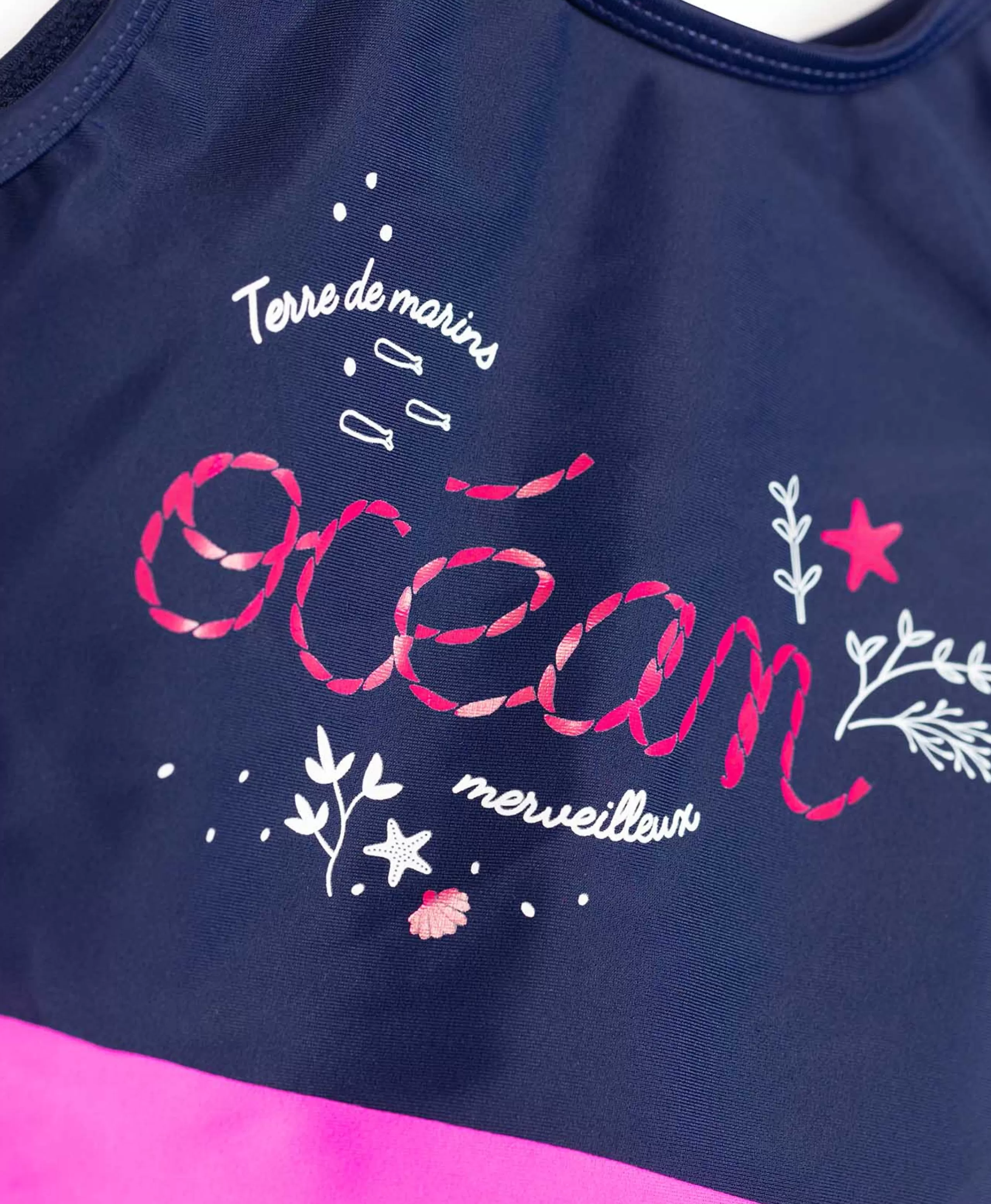 Maillot de bain 1 pièce fille – Devant uni avec imprimé- Rayé bicolore sur la partie culotte – Ceinture fluo