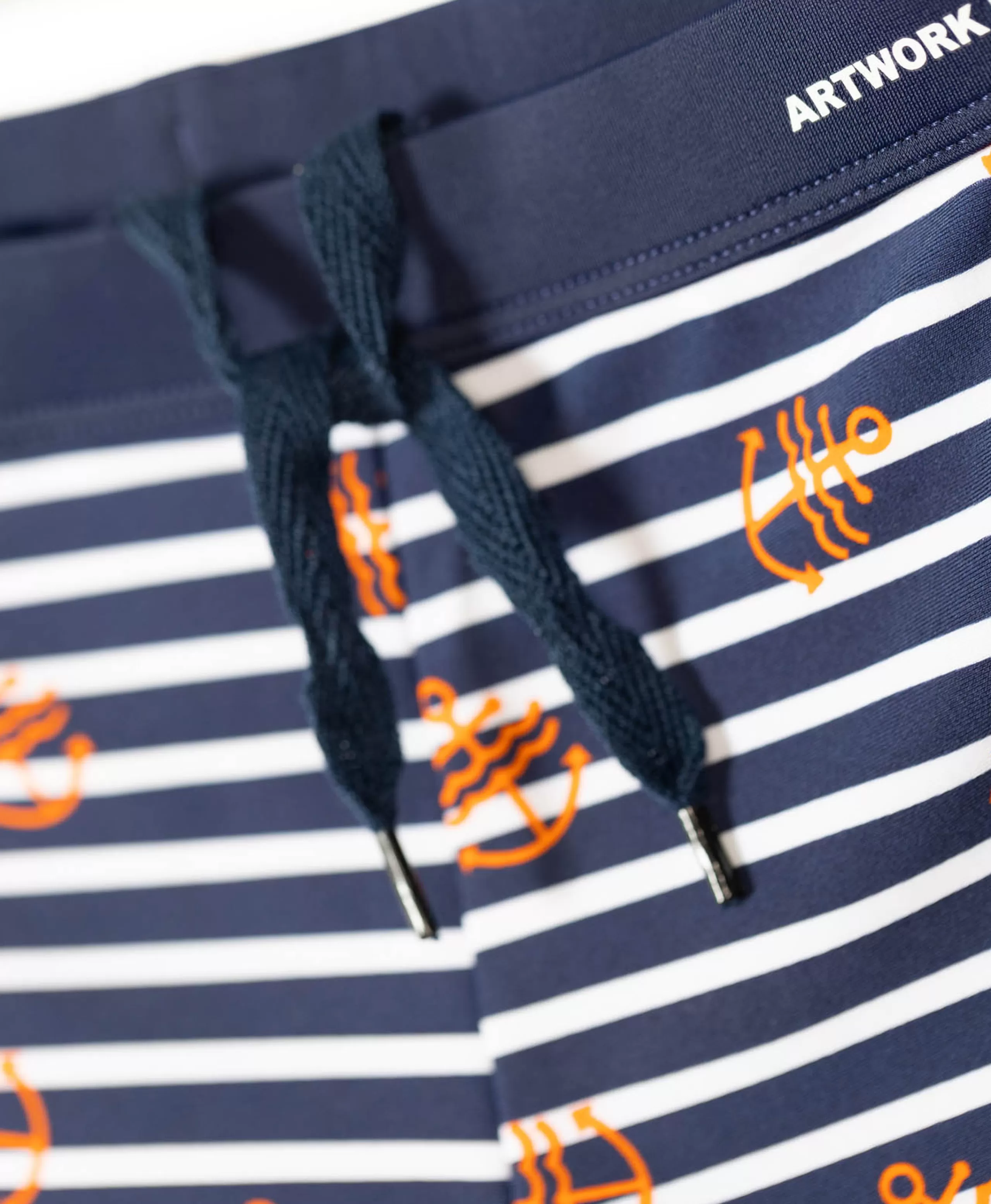 Boxer de bain garçon – Rayé bicolore et imprimé- Ceinture contrastée- Ceinture elastiquée et ajustable de l’inté…