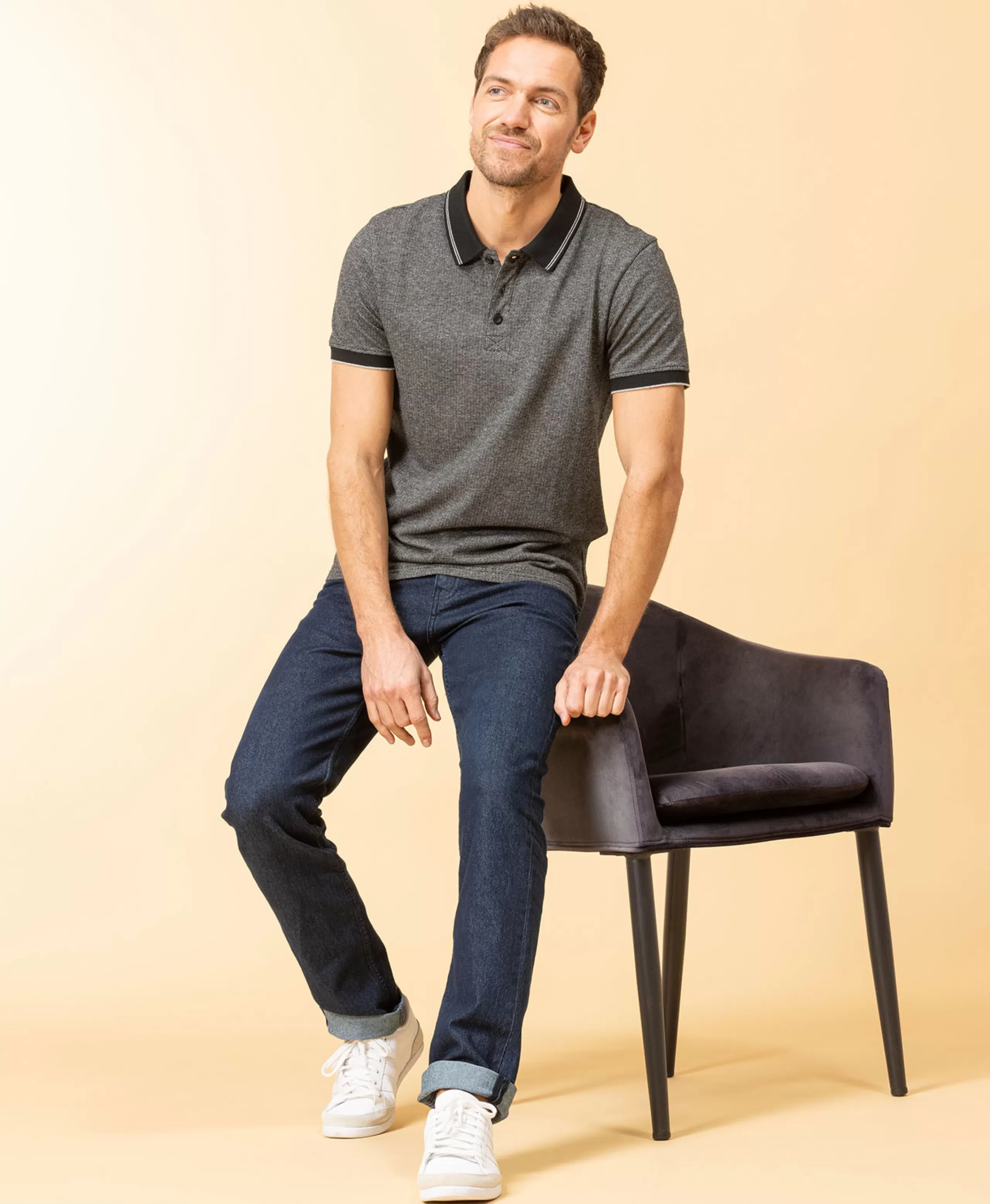Polo Homme manches courtesJersey micro jacquard bicolore Ouverture devant avec boutons gravés Col et bas manches en b…