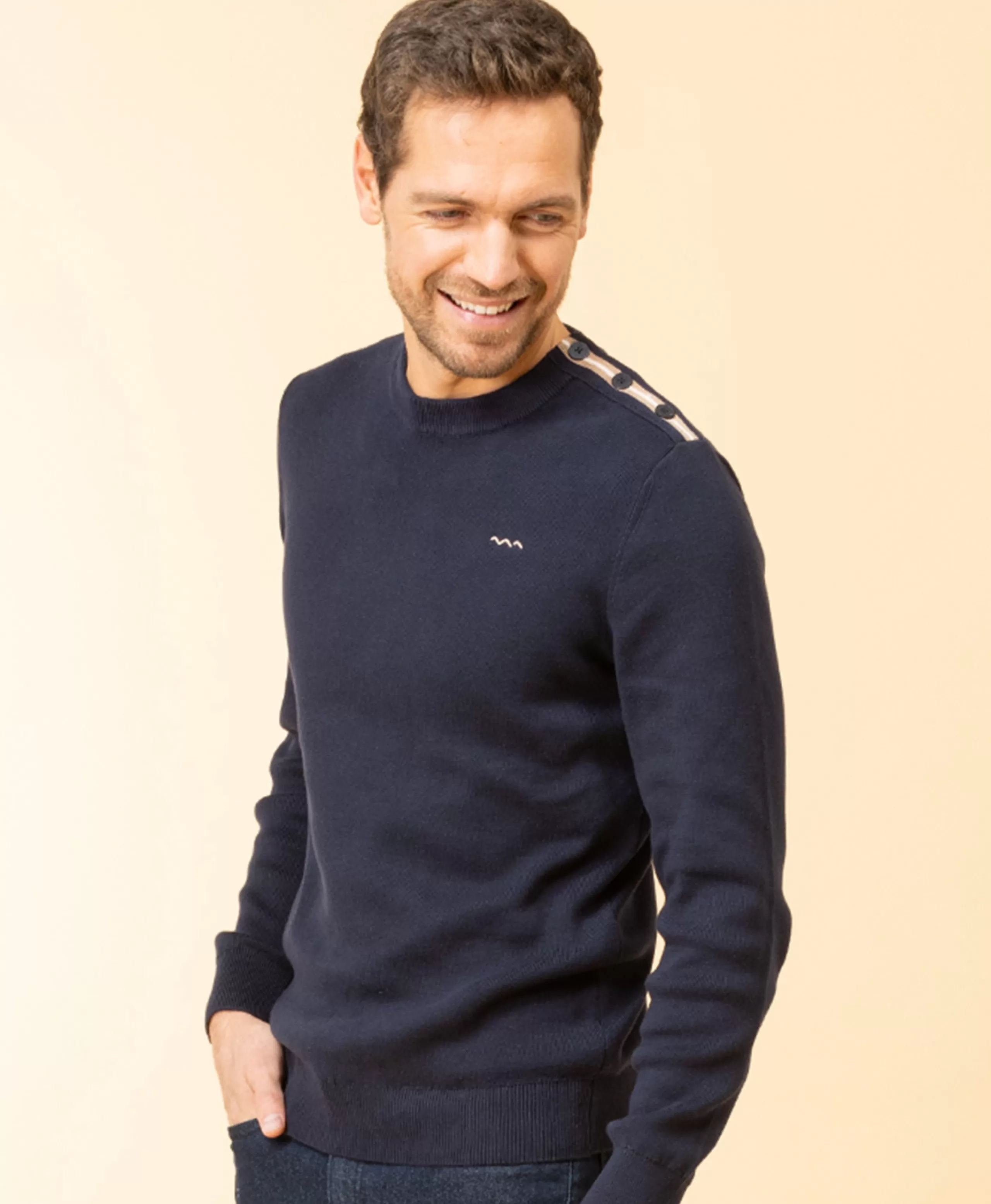 Pull Homme manches longues col rondCouleur unie Ouverture épaule avec boutons gravésDétails fantaisies sur patte de…