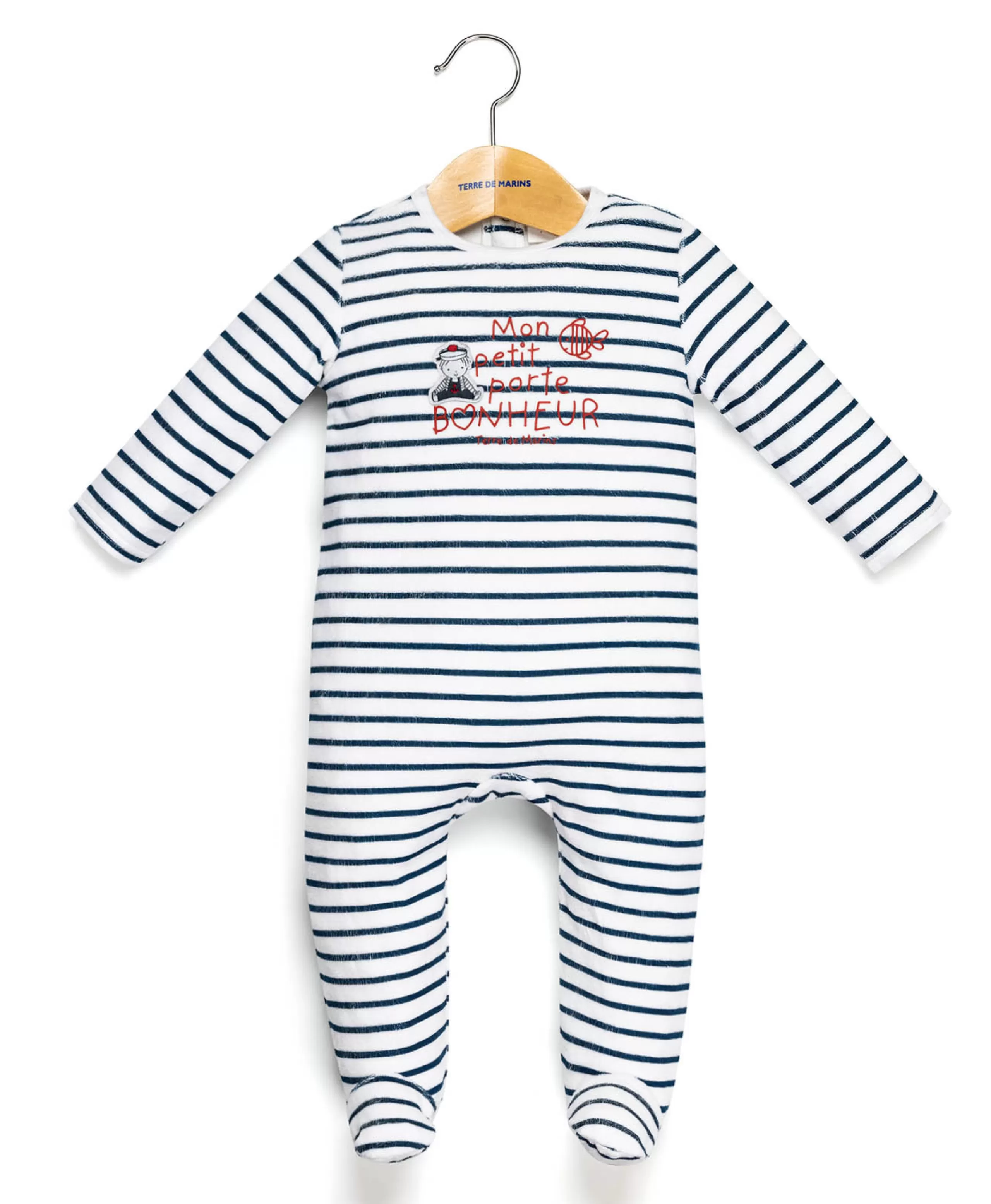 Pyjama Bébé garçon manches longues -Velours rayé bicolore-Imprimé devant-Ouverture dos pression-Bas pied elastiqu…