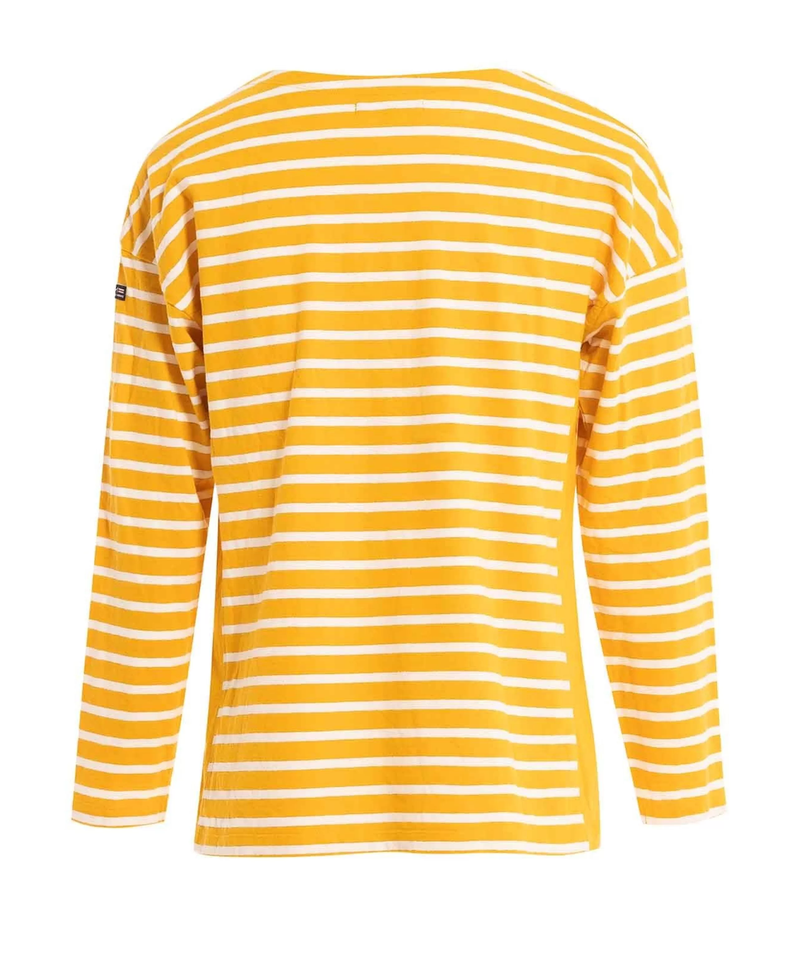 Tee shirt manches longues femme-fond blanc raye jaune 99 % COTON – 1 % FIL MÉTALLISÉ – col bateau avec 3 boutons sur u…